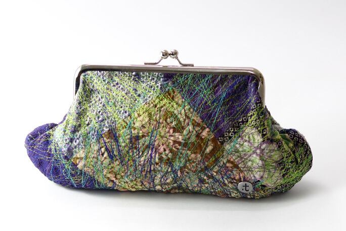 着物生地を接ぎ合わせた上に施された色とりどりのステッチが躍動的。
